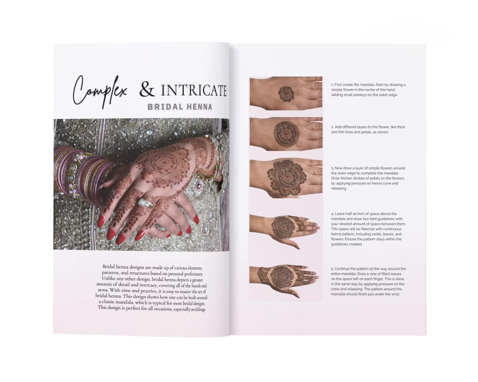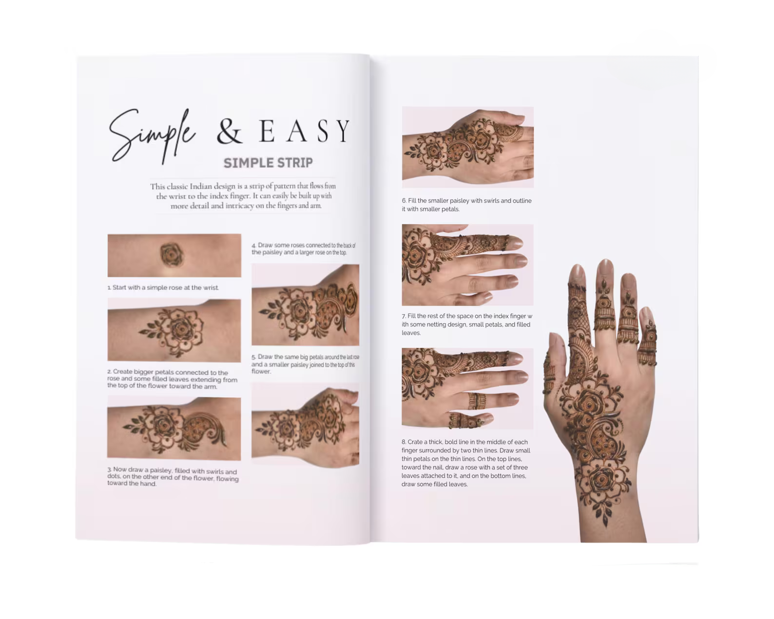 Get hands-on experience with step-by-step tutorials on creating stunning henna tattoos. From basic designs to intricate patterns, our e-workshop PDF Manual provides you with the skills to express your creativity and create beautiful body art.
