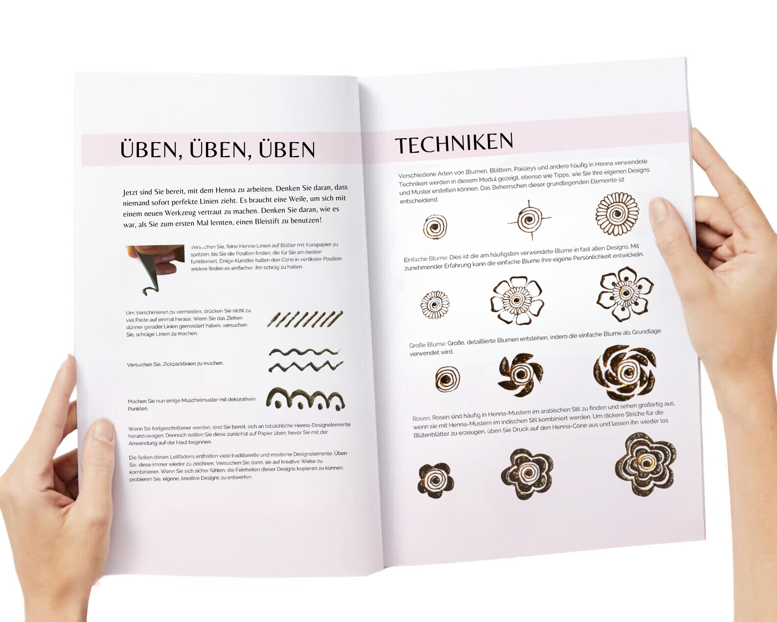 Erlerne die Kunst des Henna mit diesem digitalen E-Workshop-Handbuch mit einem umfassenden Inhalt über die Henna Geschichte, die Zubereitung der Henna Paste, Anwendungstechniken, Henna-Tattoo-Designs und mehr.