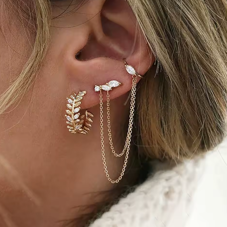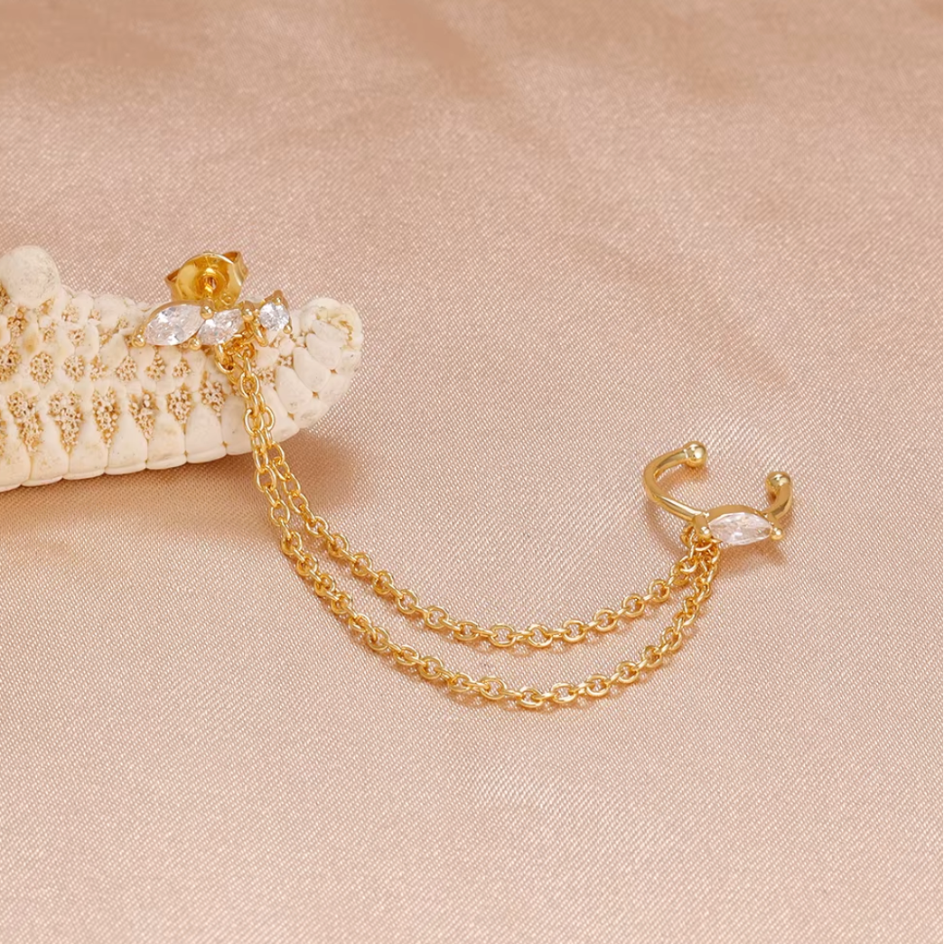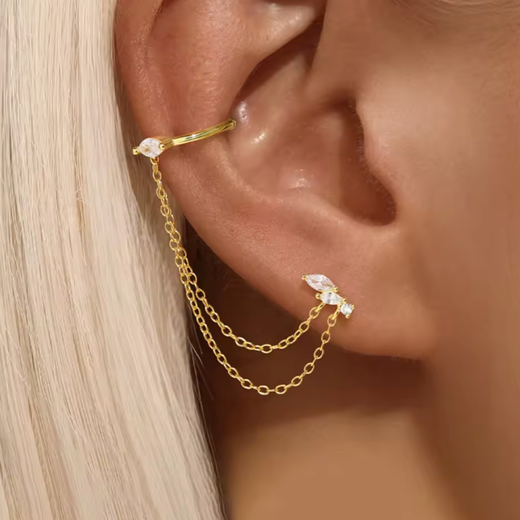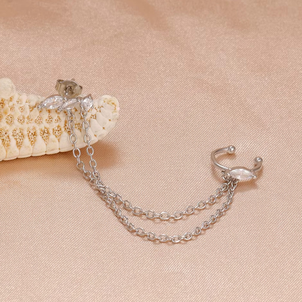 Dieser schöner Ohr-Cuff vereint minimalistisches Design mit maximaler Wirkung. Einfach ansetzen, leicht zusammendrücken und schon sitzt dein neues Schmuckstück mit schöner Kette als Ohrschmuck.