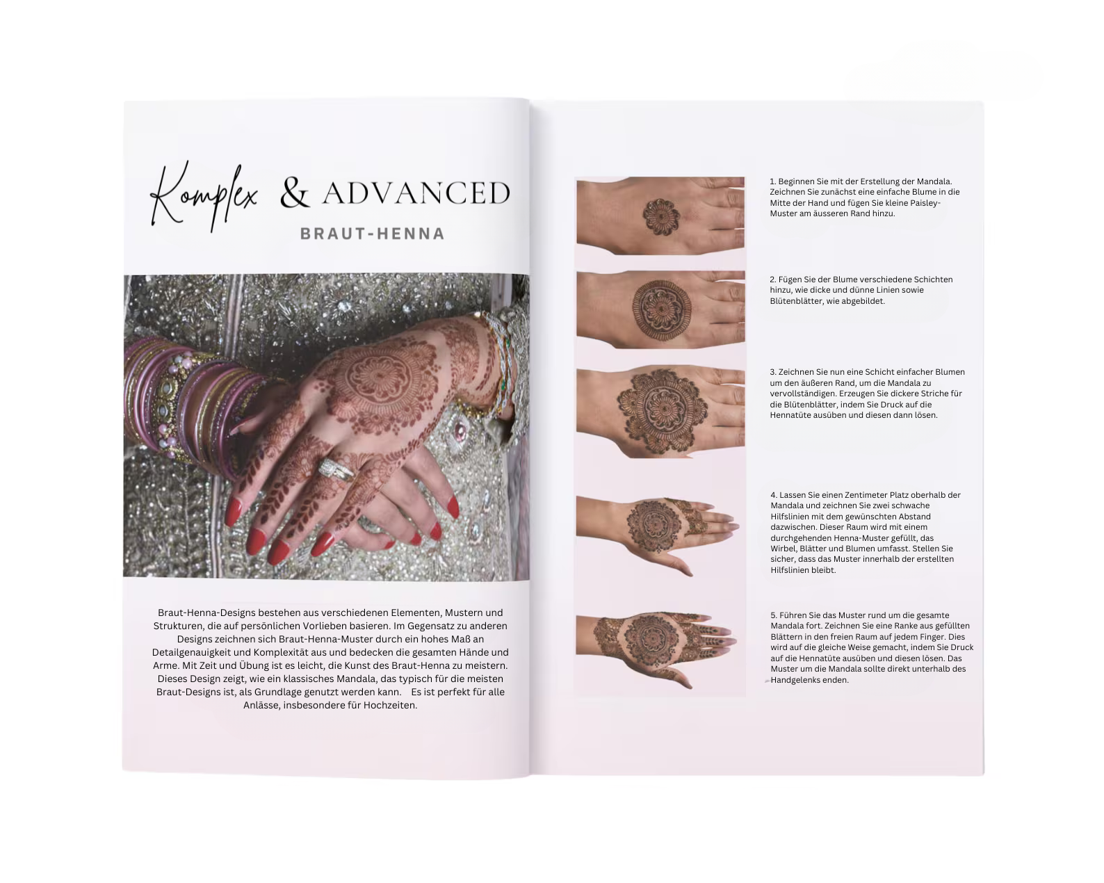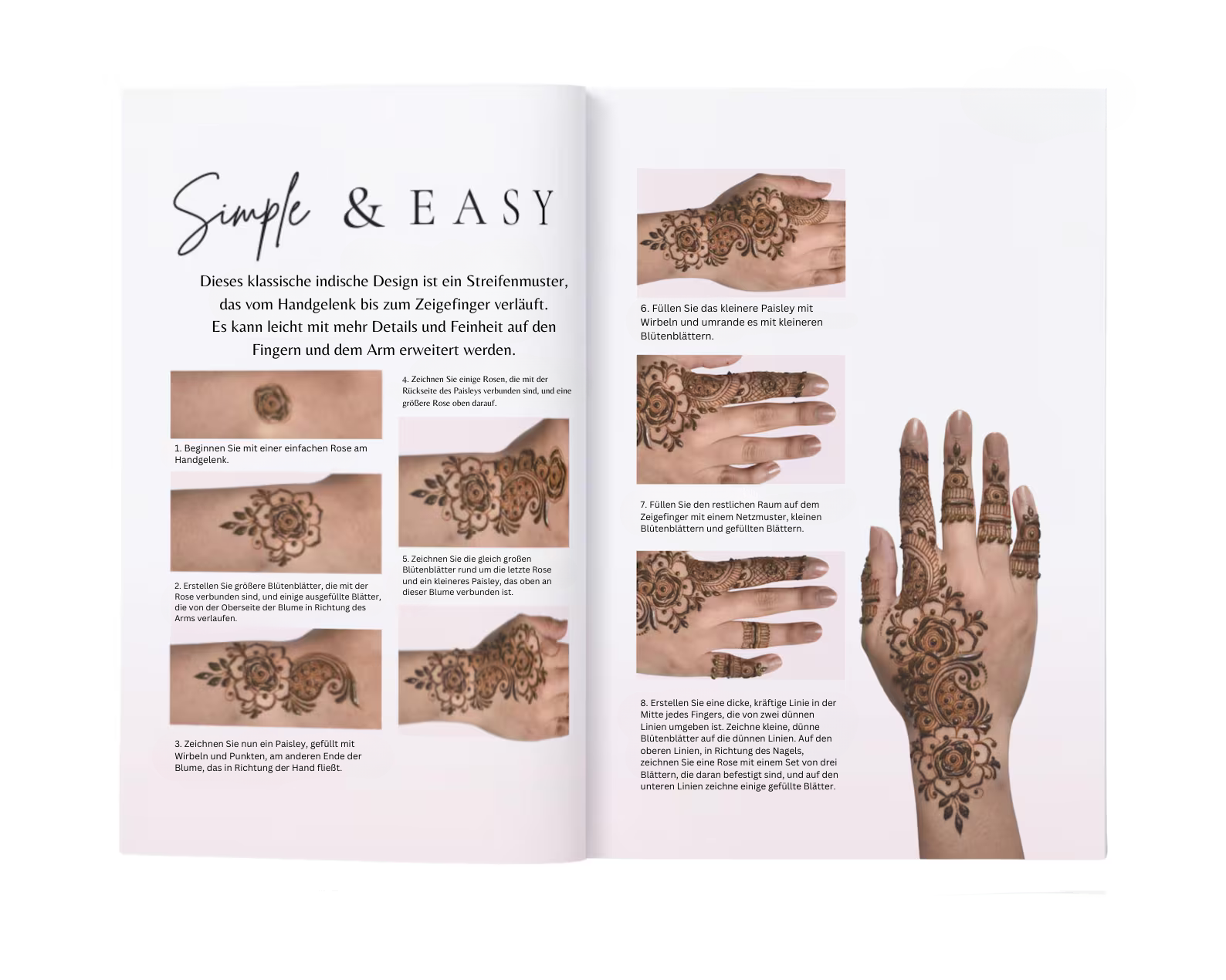 Erlerne die Kunst des Henna mit diesem digitalen E-Workshop-Handbuch mit einem umfassenden Inhalt über die Henna Geschichte, die Zubereitung der Henna Paste, Anwendungstechniken, Henna-Tattoo-Designs und mehr.