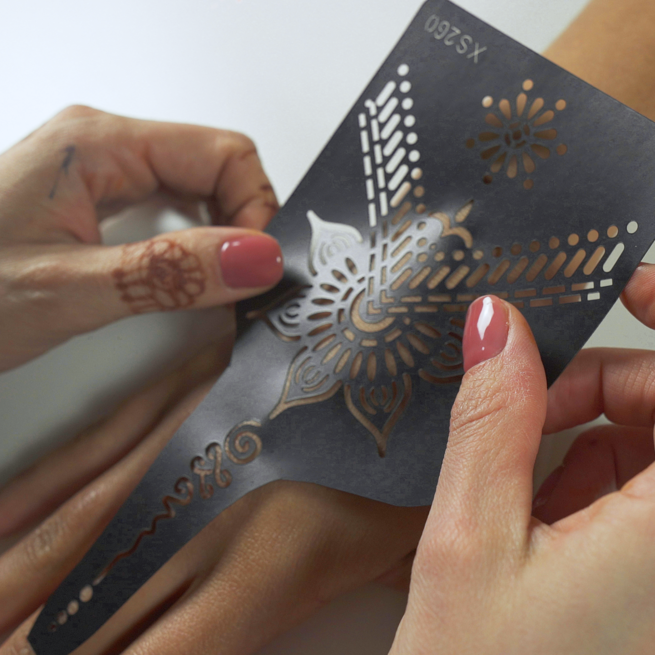 Ein Henna Tattoo kannst Du ganz ohne Aufwand und ohne Kleckern mit der Schablone perfekt kreieren. Für alle Hauttypen geeignet, individuell anpassbar und natürlich vegan & tierversuchsfrei – lass deiner Kreativität freien Lauf!
